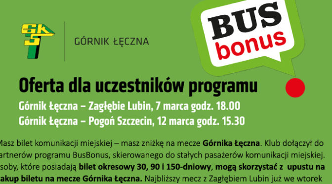 Masz bilet komunikacji miejskiej – masz zniżkę na mecze Górnika Łęczna. Klub dołączył do partnerów programu BusBonus, skierowanego do stałych pasażerów komunikacji miejskiej.