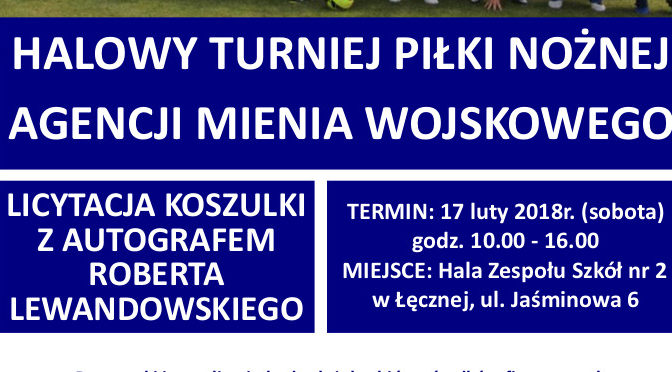 Zapraszamy na Halowy Turniej Piłki Nożnej Agencji Mienia Wojskowego, który odbędzie się w sobotę 17 lutego 2018 r. w godz. 10.00-16.00 w Hali Zespołu Szkół nr 2 w Łęcznej przy ul. Jaśminowej 6.
